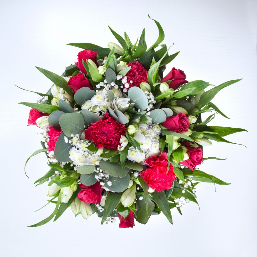 Immerse yourself in a world of refined beauty with our opulent bouquet. This captivating arrangement blends the soft delicacy of mini white chrysanthemums and graceful gypsophila with the passionate allure of red roses and carnations. Enhanced by the understated charm of white alstroemeria and lush aspidistra leaves, every petal is meticulously selected for premium freshness and elegant design.